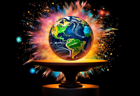 A captivating 3D rendering of a fragmented Earth globe, surrounded by glowing sparks, symbolizing global change and environmental awareness in a mystical atmosphere.