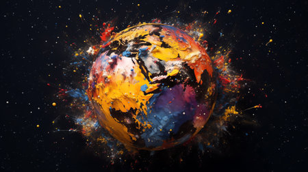 This abstract artwork captures a fragmented globe with fiery cosmic elements, representing global issues and the quest for unity amidst chaos in a striking visual.