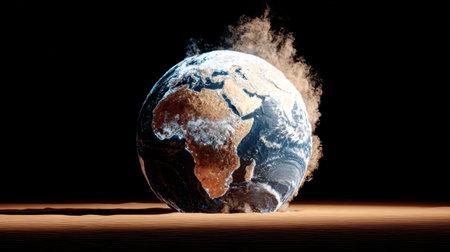 Stunning representation of Earth view with clouds and dust effects, set against a dark background. Perfect for concepts of nature and environmental awareness.