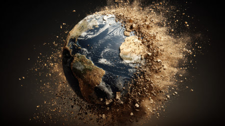 This captivating image depicts Earth erupting with soil and dust, symbolizing environmental fragility and the intricate balance of nature.