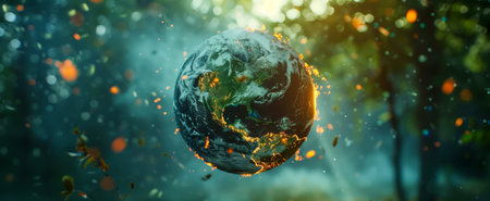 An abstract depiction of earth suspended with glowing particles in a vibrant forest setting