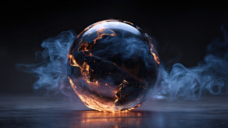 A translucent globe is depicted with fiery internal elements and smoky wisps. The image uses a dark color palette with contrasting light effects, suggestive of heat and energy. The scene, possibly digitally created, evokes a sense of both destruction and creation, suitable for various conceptual projects.