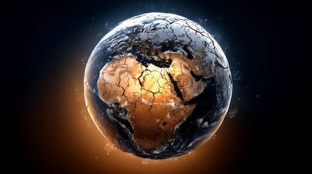 Dramatic artwork depicting a cracked Earth with glowing elements symbolizing environmental change and the impact of global warming.