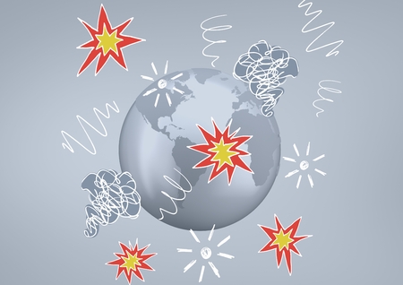 3d rendering of earth globe with ball bomb fuse on yellow background. Bomb ready to explosion.