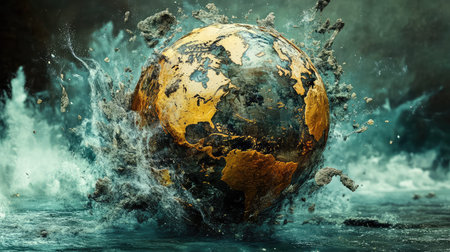 This captivating image showcases a cracked globe representing the fragile state of our planet. The rich blue and yellow tones against a dark background create a striking contrast.