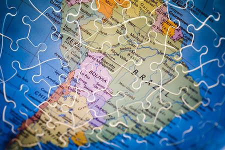 Earth crystal ball with white jigsaw puzzle on a black background.