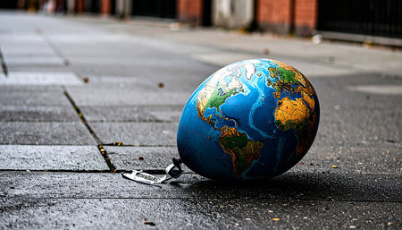 Globe printed balloon fully deflated and lying flat on smooth concrete, symbolizing global market collapse or recession, overcast light, minimalist setup