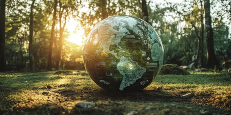 A beautiful glass globe sits on lush green grass, highlighting the continents and oceans. This imagery invokes thoughts of nature, ecology, and sustainability.