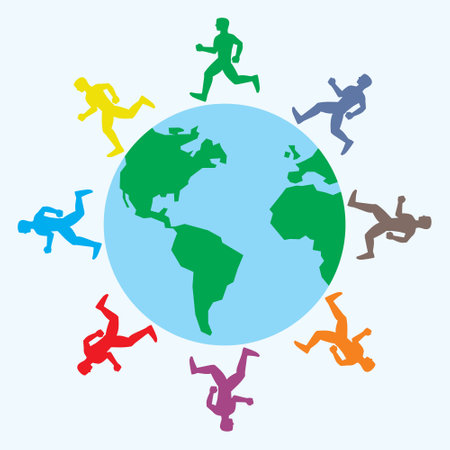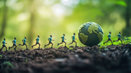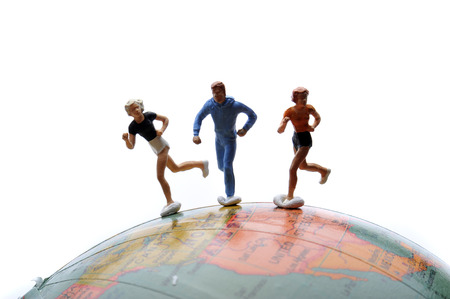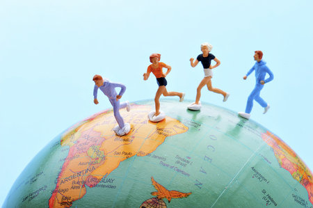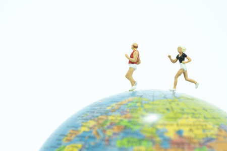 Miniature people : marathon runners with world map, jogging and running,healthy lifestyle and sport concepts.