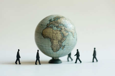 Figures walk around a globe symbolizing unity and exploration in a minimalist and tranquil environment.
