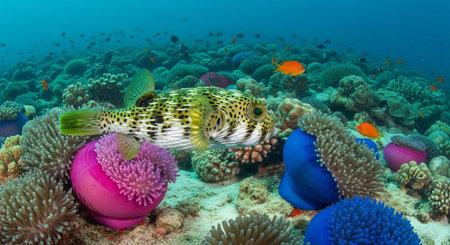 White-spotted puffer in the sea. Sea Scenery Travel photo Top view
