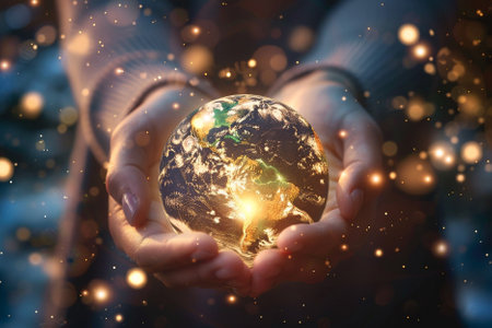 Hands cradle a luminous globe representing Earth, symbolizing hope and responsibility. Setting features soft blue tones and warm light, inspiring connection to nature.
