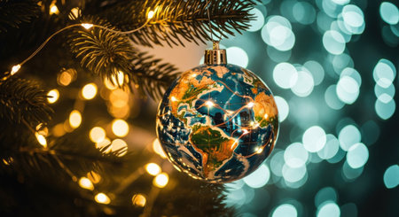 Globe on Christmas tree with bokeh lights background. Christmas and New Year concept.
