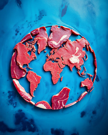 A map of the world created entirely from a variety of fresh fruits and vegetables, showing the different continents and countries using colorful and vibrant produce.