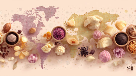 Various dessert ingredients artfully arranged against a world map backdrop, illustrating international flavors and culinary diversity in a creative display.