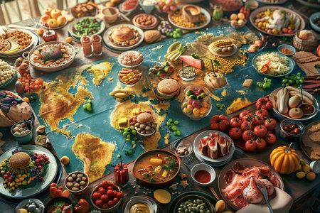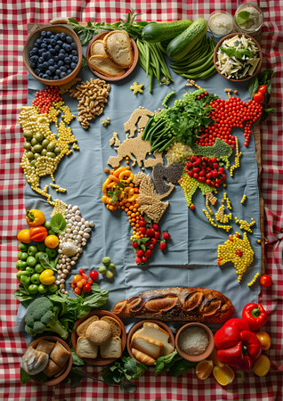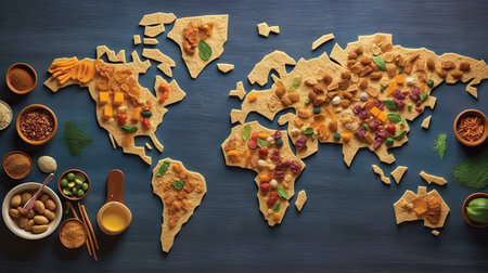 Explore a vibrant culinary map crafted from diverse dishes representing global flavors and cultures, highlighting vibrant ingredients and textures.