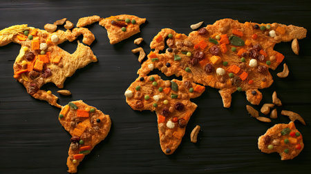 A stunning representation of global cuisine, this image features a creative map filled with various dishes, highlighting the rich diversity of cultural flavors and culinary traditions around the world.