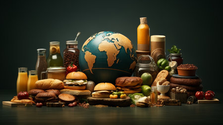 A table full of food with a map of the world in the background. The table is covered with a variety of dishes, including sandwiches, fruits, vegetables, and meats. Concept of abundance and celebration