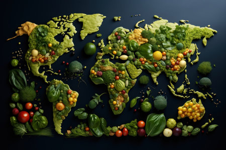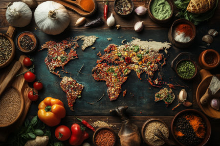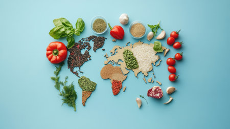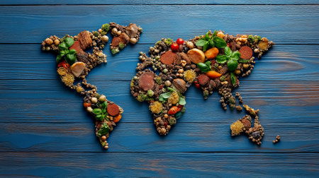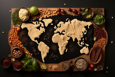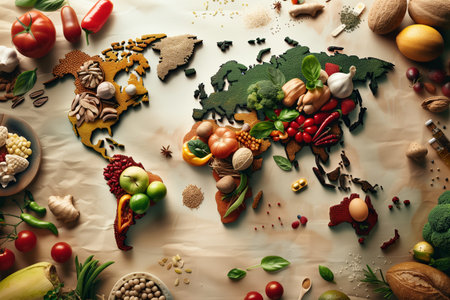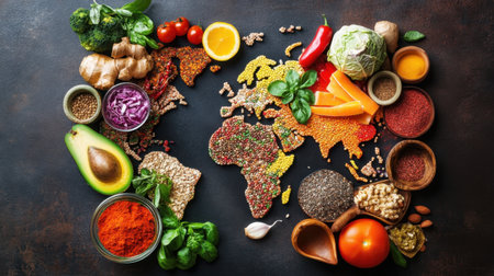 Artistic representation of a world map made from fresh ingredients, including vegetables, herbs, and spices. Perfect for food enthusiasts and culinary projects.