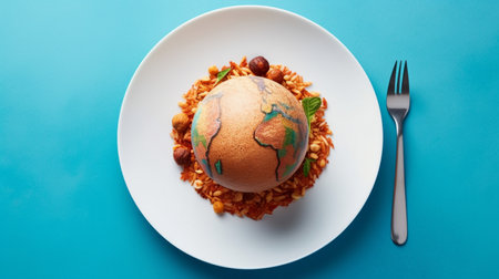 A dinner setting with the Earth as the main dish on a plate, highlighting global hunger awareness and food security on World Food Day.