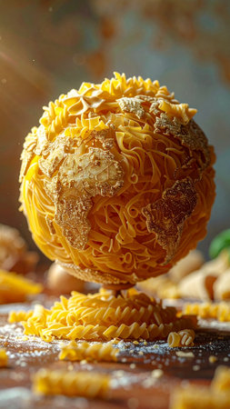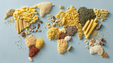 A creative arrangement of pasta shapes and grains forms a world map. Different types of pasta represent countries and regions, highlighting diverse culinary traditions and ingredients.