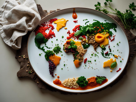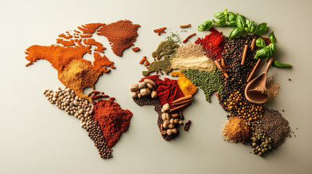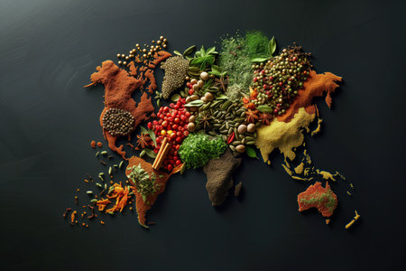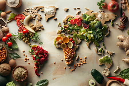 Explore an artistic arrangement of fresh vegetables and spices forming a map of the world, symbolizing culinary diversity and global flavors in a vibrant composition.