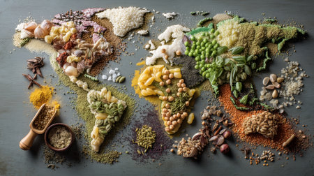 A colorful map of the world crafted from diverse grains, spices, and pasta is displayed on a neutral background, showing culinary diversity from different regions.