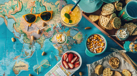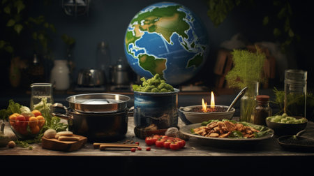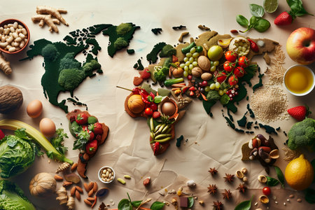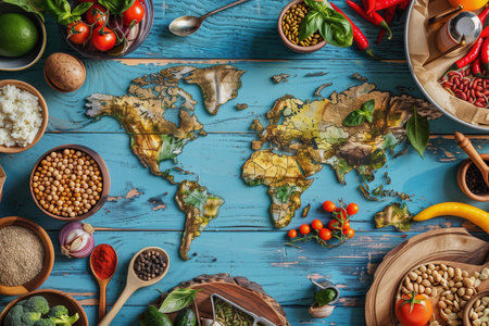 A vibrant arrangement of fresh vegetables and ingredients against a artistic map design, showcasing the essence of global cuisine and healthy eating.