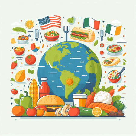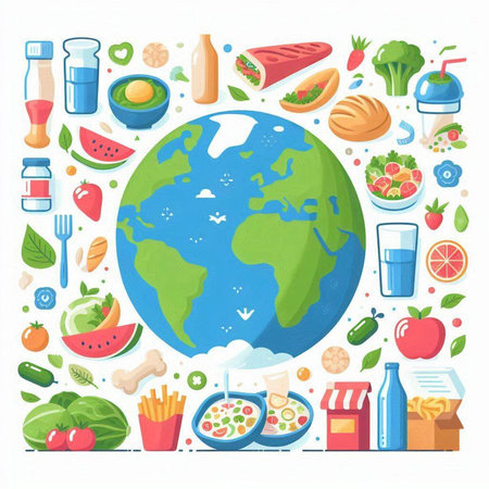 World food day concept. Earth planet, food and drinks. Vector illustration