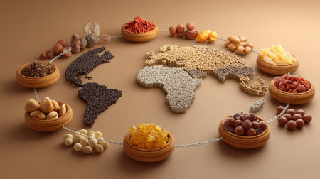 A stunning artistic representation of a world map created from an array of grains, seeds, and nuts, highlighting nature's diversity and harvest.