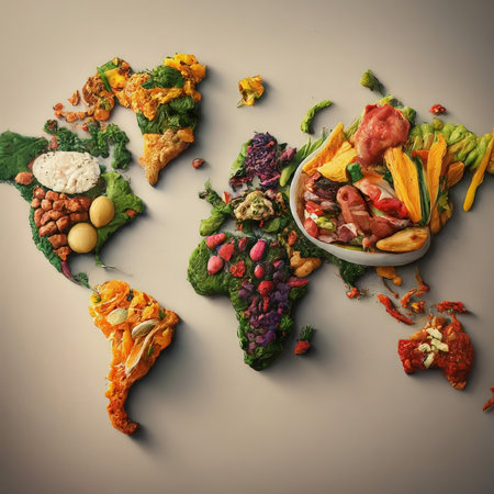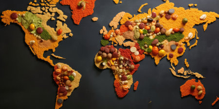 A world map crafted from diverse global ingredients, symbolizing culinary unity and diversity.