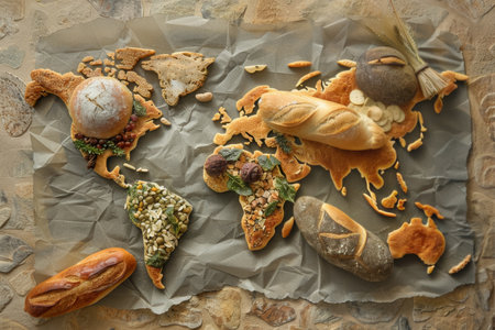 A creative flat lay of various bread types arranged to form a world map, showcasing the diversity of baking cultures globally.