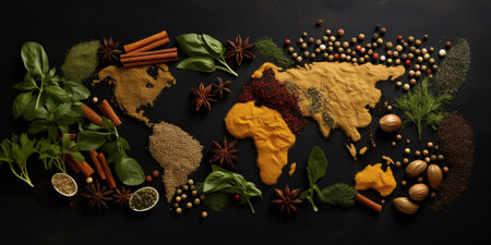 World map made from assorted spices and grains on a dark background. Culinary and global cuisine concept. Design for food blog, cultural diversity, cooking theme, various food ingredient. AIG35.