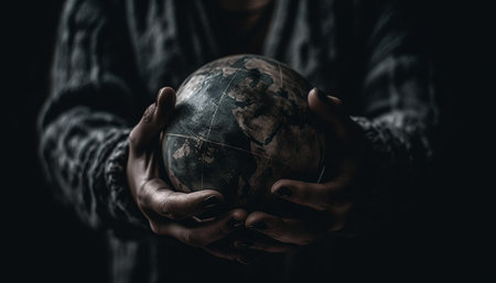 A digital composite features a luminous Earth globe held within a silhouetted hand, set against a dark backdrop. The planet displays vibrant city lights, contrasting with the hand's soft glow. This visual represents a concept of care or stewardship, suitable for science, technology, or environmental themes, potentially for advertising or editorial use.