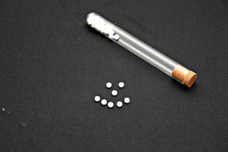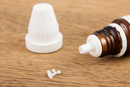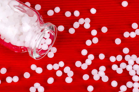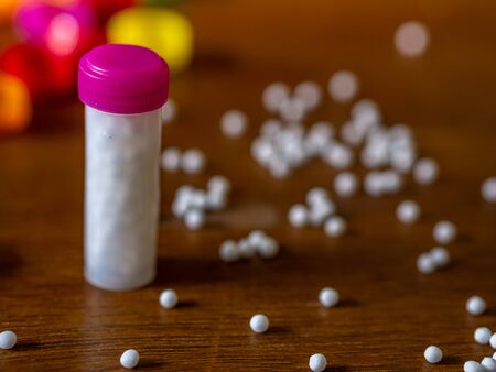 Homeopathic granules .Homeopathic granules in small glass flask, some granules scattered on the table with reflection