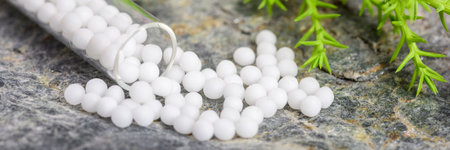 Alternative medicine with white homeopathic granules and natural plants in the background