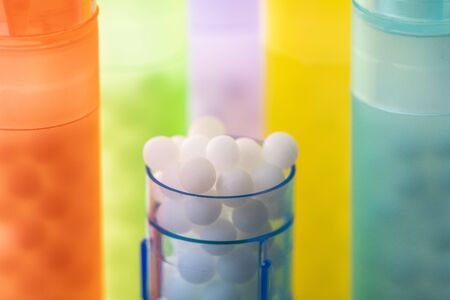 Colorful plastic Bottles filled with white homeopathic pills/globules