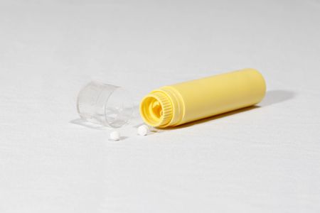 Homeopathic globules and with a plastic jar on a yellow background. Alternative Homeopathy medicine herbs, healtcare and pills concept. Flatlay. Top view. copyspace for text. Homeopathy for children