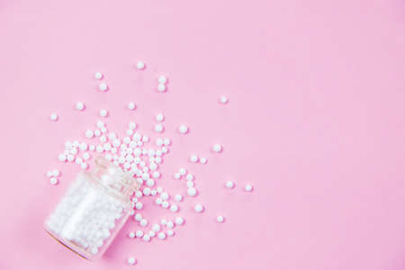 Homeopathic globules in a clear glass bottle on light pink background, alternative homeopathy medicine and naturopathy concept, copy space.