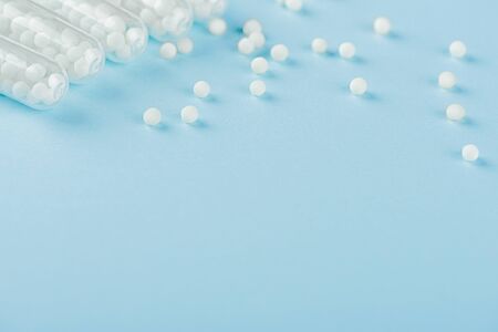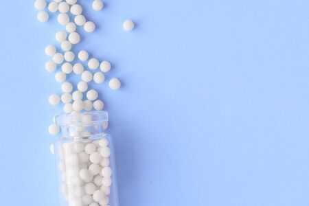 Homeopathy, globules scattered out of glass bottle, blue background. Natural alternative medicine, copy space