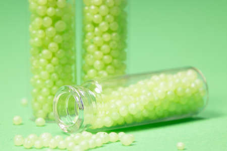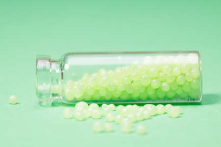 Homeopathy concept. Homeopathic globules out of a glass bottle, green background. Alternative herb medicine healtcare pills, copy space