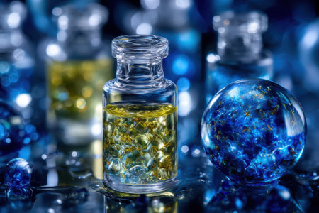Glass containers filled with vibrant liquids and decorative elements create an artistic display on a shiny surface.