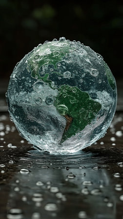 crystal ball with water drops on a wooden surface, concept of global warming