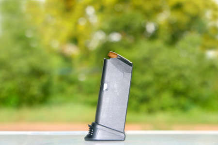 ammunition handgun magazine on blur green tree background.