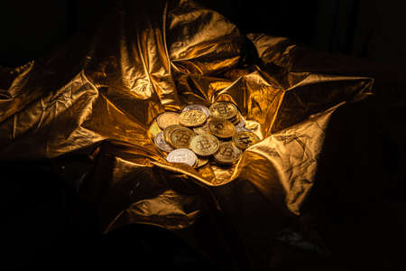 crypto coin and bitcoin on golden background,gold mining background