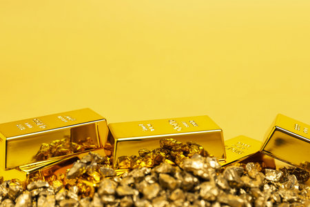 Gold nuggets and bars on yellow background, closeup