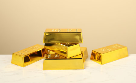Shiny gold bars on light wooden table against beige background, closeup