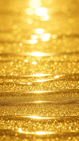 A close-up of a shimmering golden liquid surface with bright sunlight reflections and bokeh creates a textured background.
