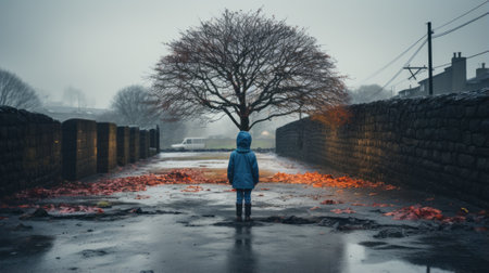 A young boy in a dark hoodie with the hood up, walking along an empty street on a rainy day, with puddles reflecting the soft city lights.