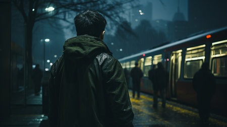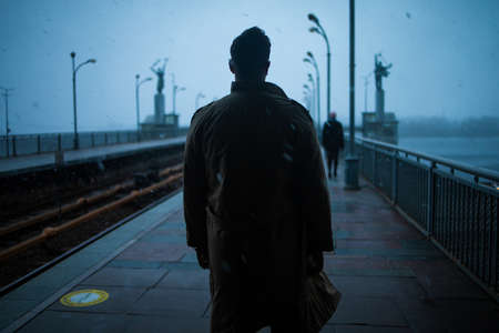 Back of cinematic young man in winter coat walking outside in urban city on bridge on a moody, foggy, winters night.